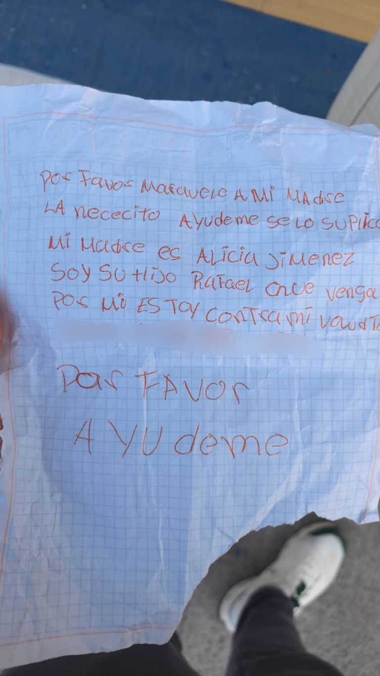 “Por favor márquele a mi madre, la necesito, ayúdenme, se lo suplico. Mi madre es Alicia Jiménez. Soy su hijo Rafael. Que venga por mí, estoy contra mi voluntad” (y agregó un número de teléfono, al parecer de Puerto Vallarta). “Por favor, ayúdeme”.
