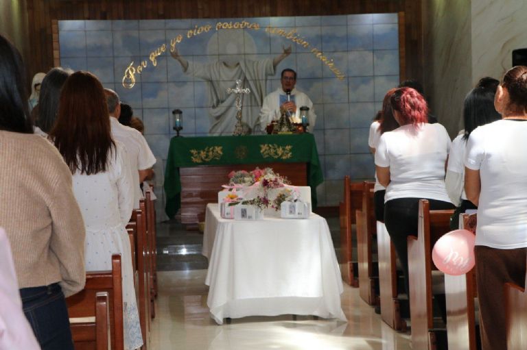 En la capilla, los pequeños féretros blancos —algunos ceñidos con listones rosas y coronados con ramos diminutos de flores— reposaban sobre una mesa cubierta con un mantel blanco, colocada frente al altar. Las bancas fueron ocupadas por mujeres y hombres vestidos de blanco, mientras un sacerdote oficiaba la ceremonia bajo la imagen de Cristo con los brazos abiertos. Posteriormente, cada caja, marcada con códigos, fue sostenida por integrantes de la asociación y vecinos que acompañaron el acto.