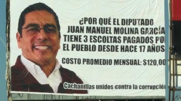 “¿Por qué el diputado Juan Manuel Molina García tiene 3 escoltas pagados por el pueblo desde hace 17 años? Costo promedio mensual: 120 mil pesos”, se lee, además de que está firmado por un grupo identificado como “Cachanillas unidos contra la corrupción”.
