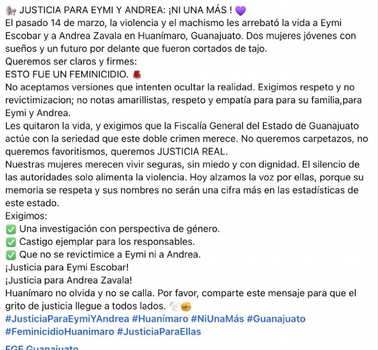 Tras las publicaciones en redes, la Fiscalía compartió un comunicado de prensa en el que señala que ambas jóvenes "perdieron la vida a consecuencia de agresiones producidas con objeto contundente".