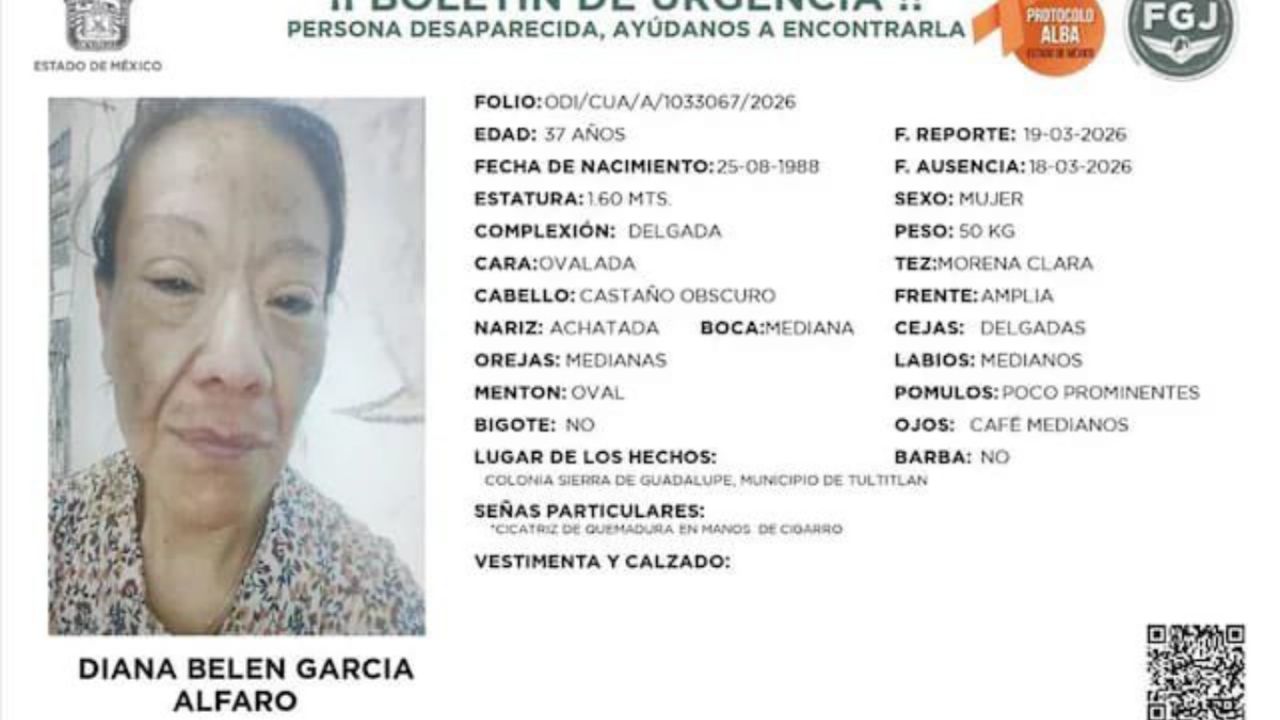 De acuerdo con informes, la mujer, de 37 años, fue reportada como desaparecida el 19 de marzo en las inmediaciones de la colonia Sierra de Guadalupe, por lo que la Fiscalía General del Justicia del Estado de México (FGJEM) activó la ficha y el protocolo de búsqueda, sin tener éxito.