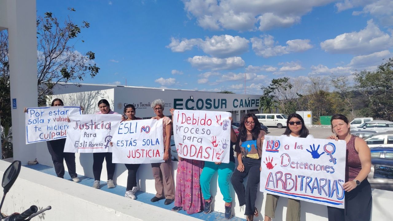 En un acto simbólico de protesta a las puertas de la unidad del Colegio de la Frontera Sur (Ecosur) en Campeche, leyeron el pronunciamiento en el que expresaron su solidaridad con la estudiante, quien fue arrestada tras participar en la marcha del 8M. Con pancartas que decían “Debido proceso para todas” y “No a las detenciones arbitrarias”, reiteraron que Esli no fue detenida en flagrancia ni con una orden de aprehensión.