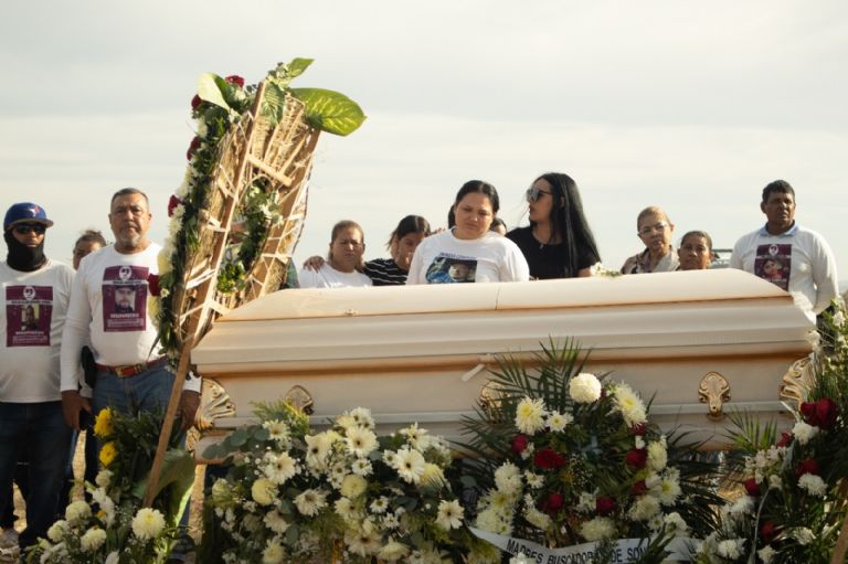 Milagros dio su mensaje frente al ataúd, cerrado por falta de cuerpo, mientras su madre trataba de no mirar. El parecido físico que hay entre ambas se extiende a las expresiones corporales, que se asemejan tras años de “obligar a las autoridades a hacer su trabajo”, como dice Cecilia.BAHÍA DE KINO/HERMOSILLO, Son. (apro).- Una caravana encabezada por Cecilia Flores Armenta a bordo de una pickup blanca llegó minutos antes de las 5 de la tarde al Panteón Municipal Norte de Hermosillo, Sonora, este 2 de abril. En la caja de la camioneta iba un ataúd y en su interior algunos huesos de Marco Antonio Sauceda Rocha, hijo de la madre buscadora, que fueron finalmente sepultados.