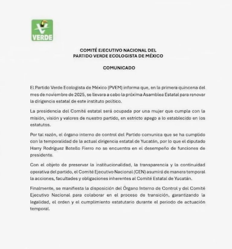 Tras la difusión del video y sin mencionarlo, el Comité Ejecutivo Nacional del PVEM informó que “Harry Rodríguez Botello Fierro no se encuentra en el desempeño de funciones de presidente”.