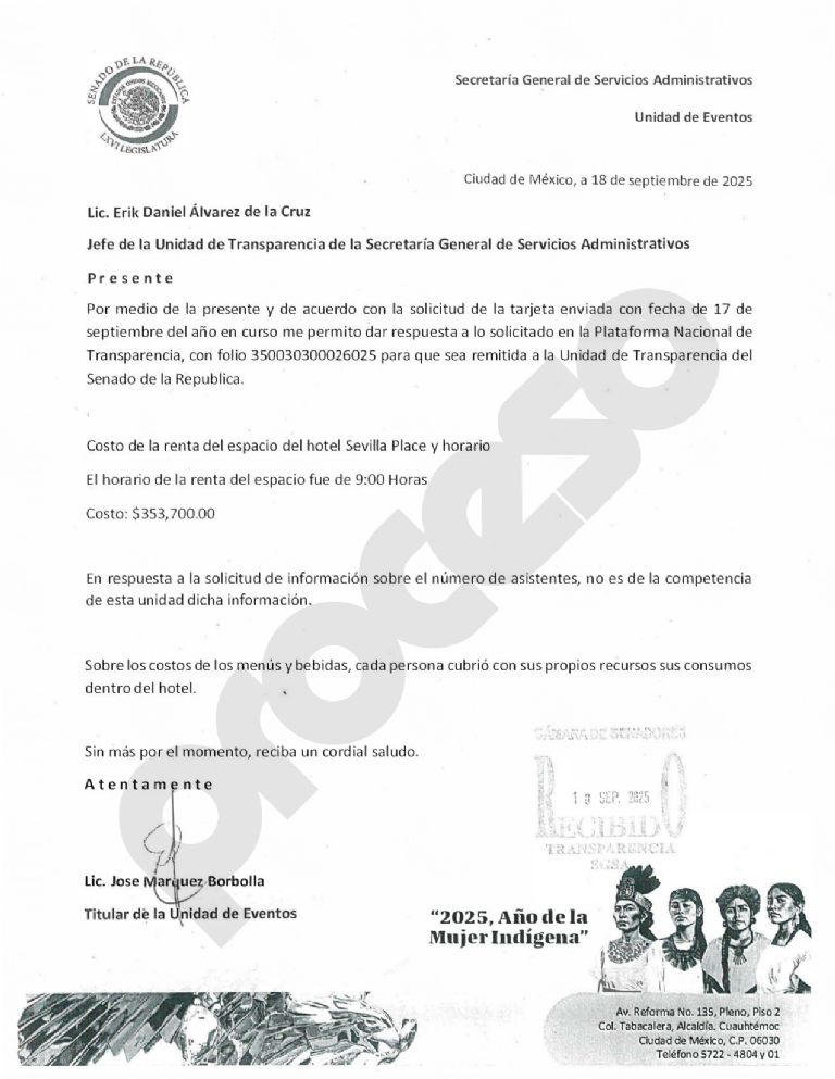 En una respuesta de información solicitada por Proceso, el titular de eventos del Senado de la República, José Márquez Borbolla, respondió que la renta por el lugar fue de 9 horas.