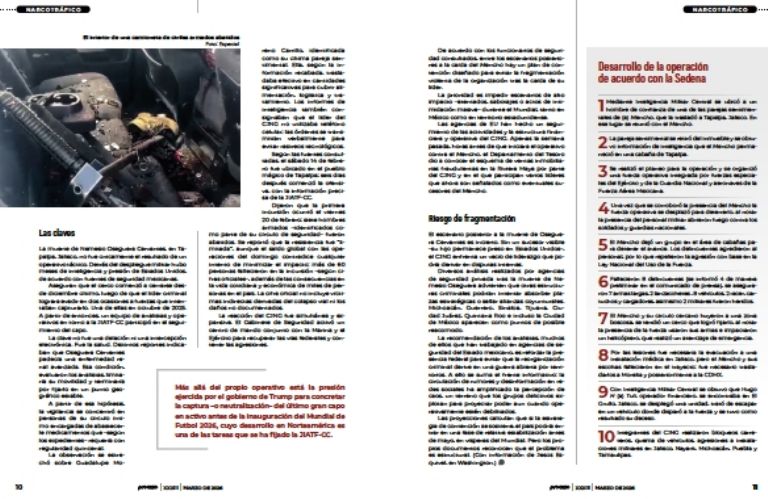 A partir de fuentes federales mexicanas y estadunidenses, Proceso reconstruye la estrategia que terminó con el abatimiento del "Mencho"; también se da cuenta de momentos del Gabinete de Seguridad previos a la ejecución del operativo y cómo éste fue pensado como un acto de soberanía ante Trump.“Con esta acción no habrá manera de que no reconozcan lo que estamos haciendo”, comentó la presidenta Claudia Sheinbaum durante una reunión del Gabinete de Seguridad, horas antes de que el Ejército mexicano ejecutara el operativo para capturar a Nemesio Oseguera Cervantes, el Mencho, en el que resultó muerto y que, además, causó numerosas bajas a esa fuerza armada.