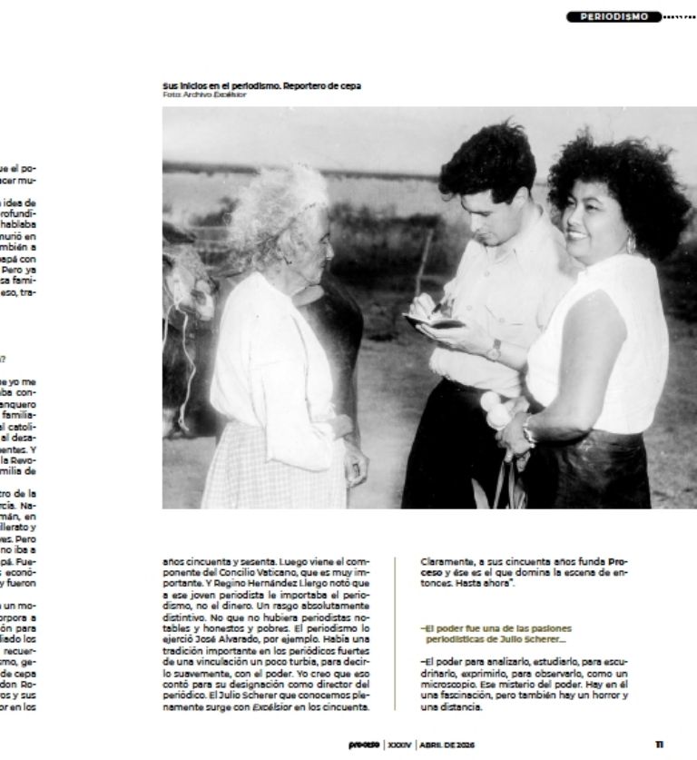 “Julio iba por su propio camino y en un momento dado Rodrigo de Llano lo incorpora a Excélsior y aquello fue una iluminación para él. Por cierto, yo recuerdo haber estudiado los reportajes de Julio con figuras, si no recuerdo mal, de personajes duros del callismo, generalotes, y ya se veía ahí al reportero de cepa y al que comenzó a apreciar mucho don Rodrigo de Llano. Y luego sus compañeros y sus maestros, que fueron varios en Excélsior en los años cincuenta y sesenta. Luego viene el componente del Concilio Vaticano, que es muy importante. Y Regino Hernández Llergo notó que a ese joven periodista le importaba el periodismo, no el dinero. Un rasgo absolutamente distintivo. No que no hubiera periodistas notables y honestos y pobres. El periodismo lo ejerció José Alvarado, por ejemplo. Había una tradición importante en los periódicos fuertes de una vinculación un poco turbia, para decirlo suavemente, con el poder. Yo creo que eso contó para su designación como director del periódico. El Julio Scherer que conocemos plenamente surge con Excélsior en los cincuenta. Claramente, a sus cincuenta años funda Proceso y ése es el que domina la escena de entonces. Hasta ahora”.