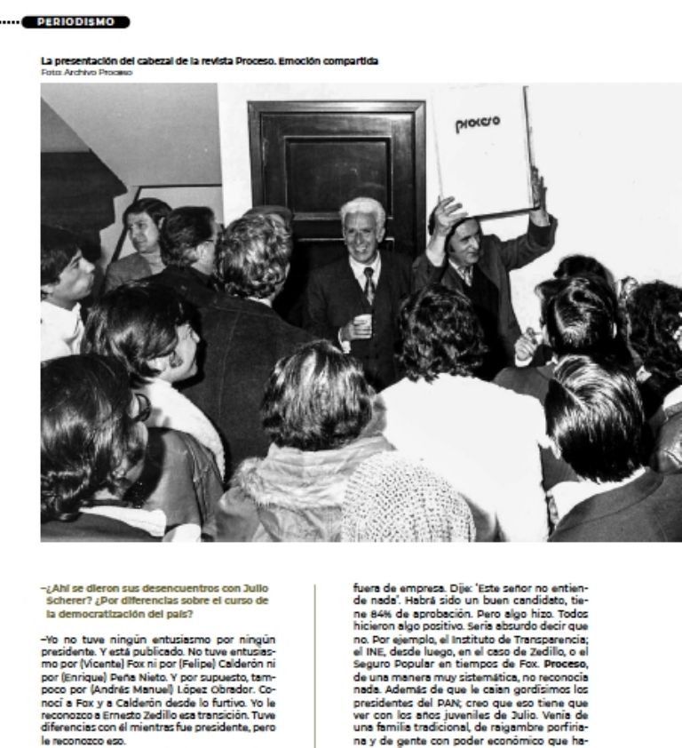 –Con la sensación de que algo absolutamente nuevo aparecía en el horizonte. Yo recuerdo la ceremonia en el hotel María Isabel. Si no recuerdo mal, fuimos Octavio Paz, Alejandro Rossi y yo. Quizá también Gabriel Zaid. Y estoy seguro que, aunque Octavio Paz ya tenía en mente la idea de continuar la revista Plural fundando una revista nueva –Vuelta–, lo que vimos fue el ejemplo y la emoción compartida en aquella reunión multitudinaria de todos los que contribuíamos a hacer Excélsior y que fuimos expulsados junto con Julio Scherer o renunciamos, como ocurrió con Plural, a seguir esa farsa en la que se convirtió el periódico. Todos sentimos esa emoción que nos motivó, que nos inspiró. Yo sabía, sentía, que estaba por nacer una voz fresca, nueva. En mis estudios de liberalismo y con la cercanía de Daniel Cosío Villegas, claramente vinculaba al mejor periodismo mexicano, que fue el periodismo del siglo XIX. Eso fue lo que sentí en ese momento. La aparición del primer número de Proceso junto con el primer número de Vuelta, dos revistas tan distintas pero hermanadas, fue muy emocionante.