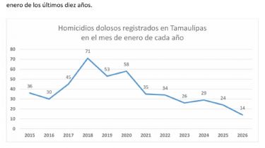 La estrategia de seguridad del gobierno de Américo Villarreal sigue dando resultadosCiudad Victoria, Tamaulipas. - En Tamaulipas se registraron 14 homicidios dolosos en enero de 2026, siendo la cifra más baja para este mes en los últimos diez años, además de representar una disminución anual del 46.2 por ciento en el promedio diario de este delito, respecto a enero de 2025, destacando como una de las entidades con mejores indicadores a nivel nacional, como resultado de la estrategia de seguridad desde el inicio del gobierno de Américo Villarreal.