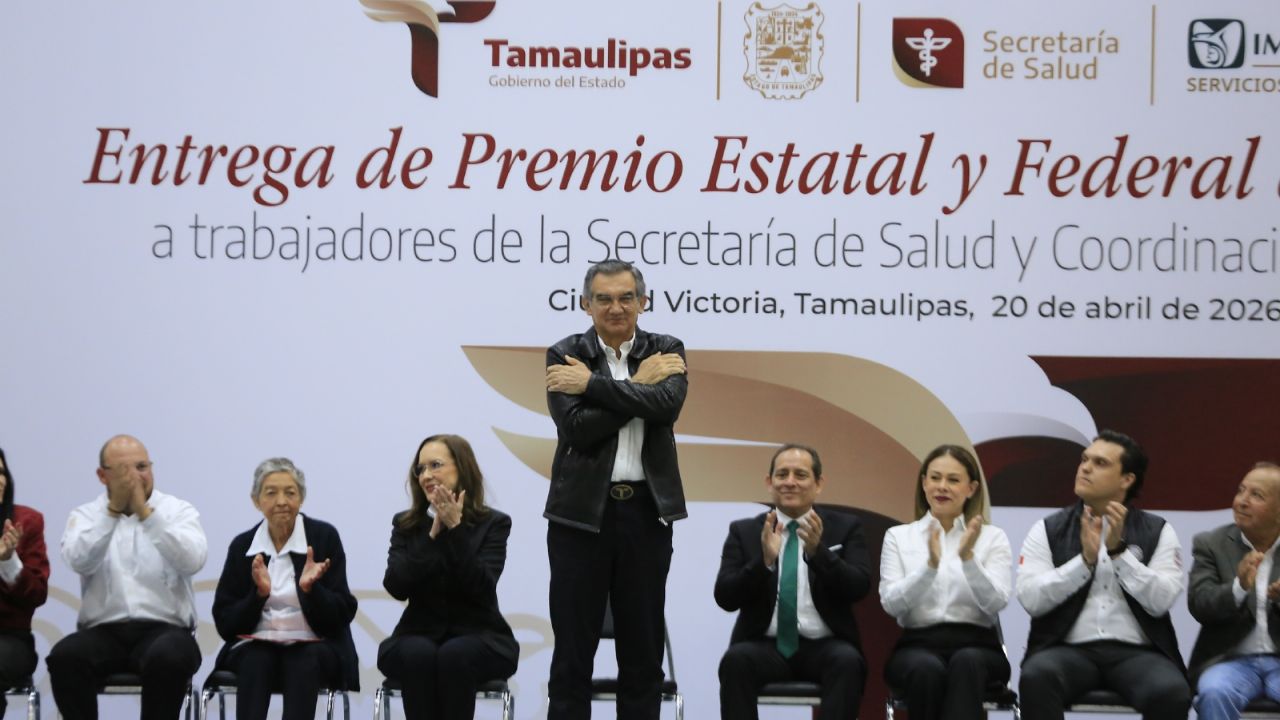 Acompañado por Marggid Rodríguez Avendaño, coordinador de IMSS-Bienestar en Tamaulipas y dirigentes sindicales, el jefe del Ejecutivo entregó 37 premios de antigüedad, de un total de 1,400 a personal de salud, destacando por 60 años de servicio, Almarcelia Cárdenas Guardado, enfermera general titulada "B", del Distrito de Salud para el Bienestar I, en Ciudad Victoria.