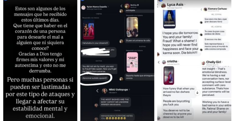 A través de una serie de historias y un comunicado publicado en su cuenta oficial de Instagram, compartió decenas de capturas de mensajes recibidos desde su victoria: insultos misóginos, acusaciones de fraude (“tu papá compró la corona”, “ganaste por influyentitis”), burlas a su físico y origen, amenazas de muerte contra ella y su familia, e incluso deseos explícitos de que “muera mañana” o “el universo la odie”.