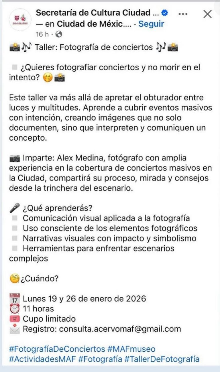El post en las redes sociales de la Secretaría de Cultura de la CDMX se promovió como “un taller que va más allá de apretar el obturador entre luces y multitudes”, marcado para impartirse del 19 al 26 de enero en el Museo Archivo de la Fotografía.