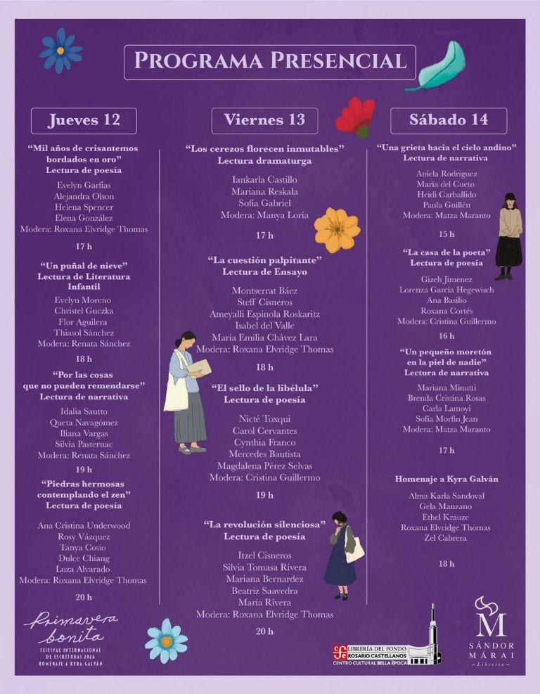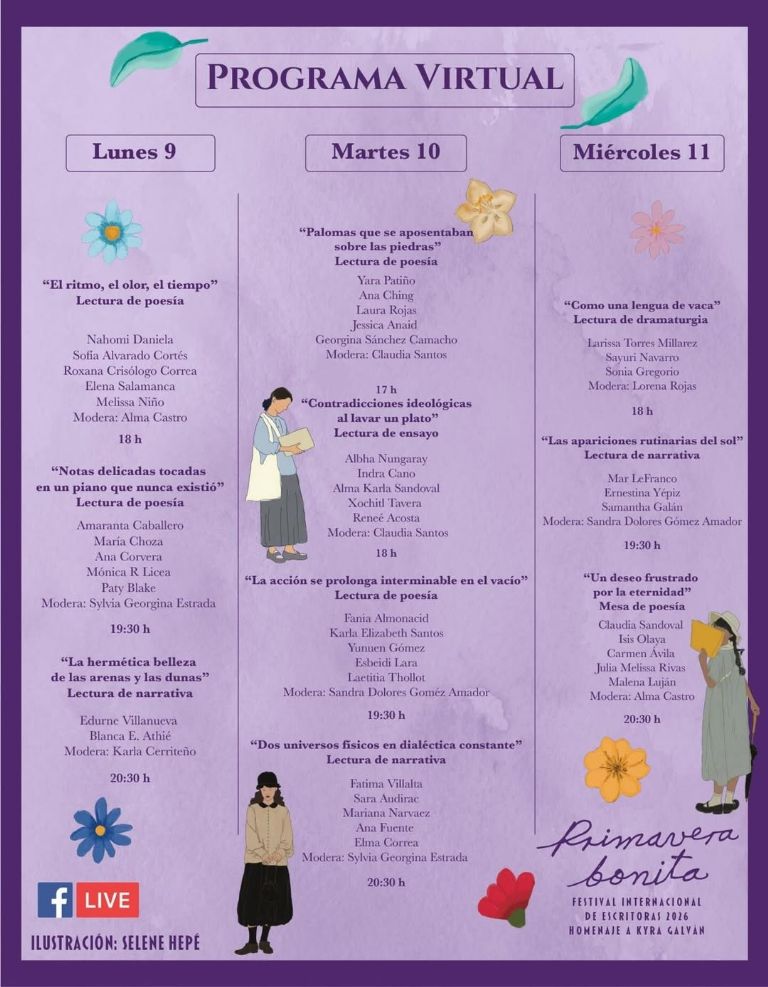 Organizado por la editorial Los libros del perro, el evento reunirá a más de 100 escritoras de México, El Salvador, Perú, Uruguay y otros países latinoamericanos, en un programa híbrido que combina actividades virtuales y presenciales para promover la obra y el pensamiento de las mujeres.CIUDAD DE MÉXICO (apro).-Con una carrera que abarca más de cuarenta años la poeta, novelista, ensayista, fotógrafa, traductora y periodista Kyra Galván será homenajeada en el Festival Internacional de Escritoras Primavera Bonita celebrará su sexta edición del 9 al 14 de marzo.