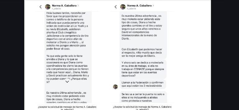 Otro mensaje: “Ya que esta gente sólo le tiene envidia a Diana y lo que se ocasionará es que Diana como coordinadora les cierre las puertas a la competencias porque no tienen nada que hacer aquí… Es nuestra última advertencia, es muy molesto estar pidiendo este tipo de cosas. Diana ha hecho grandes cambios en el tiro y estoy segura que en unos años veremos a David en competencias internacionales de la mano de Dianis”.