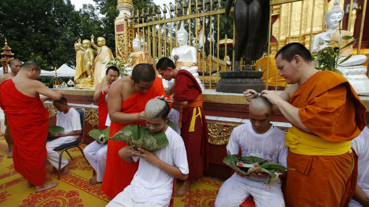 El grupo se unió a los bonzos del templo Phra That Doi Wao, en la norteña provincia de Chiang Rai, en una serie de rezos y ofrendas espirituales que continuó con los ritos de purificación, donde se afeita el pelo de los futuros monjes.