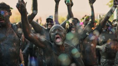 Bajo un sol abrasador, los juerguistas cubiertos de barro bailaban y gruñían como cavernícolas —“¡Uga! ¡Uga!”— mientras marchaban por la arena, acompañados por músicos.