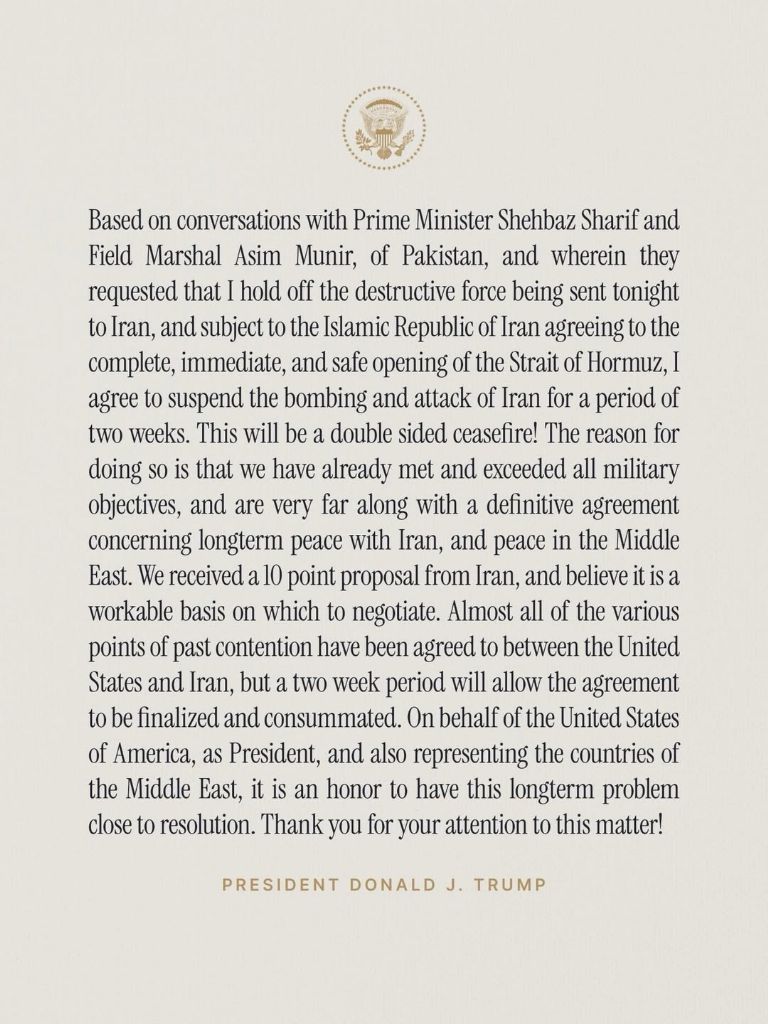 “Con base en conversaciones con el primer ministro de Paquistán, Shehbaz Sharif y con el Jefe del Estado Mayor Asim Munir, y por su petición de que contenga la fuerza destructiva que enviaría esta noche a Irán sujeta al compromiso de la República Islámica de Irán que se compromete a la inmediata y completa y segura apertura de Estrecho de Ormuz; acordé suspender el ataque y bombardeo a Irán por un periodo de dos semanas”, señalo el mandatario estadunidense en su mensaje.