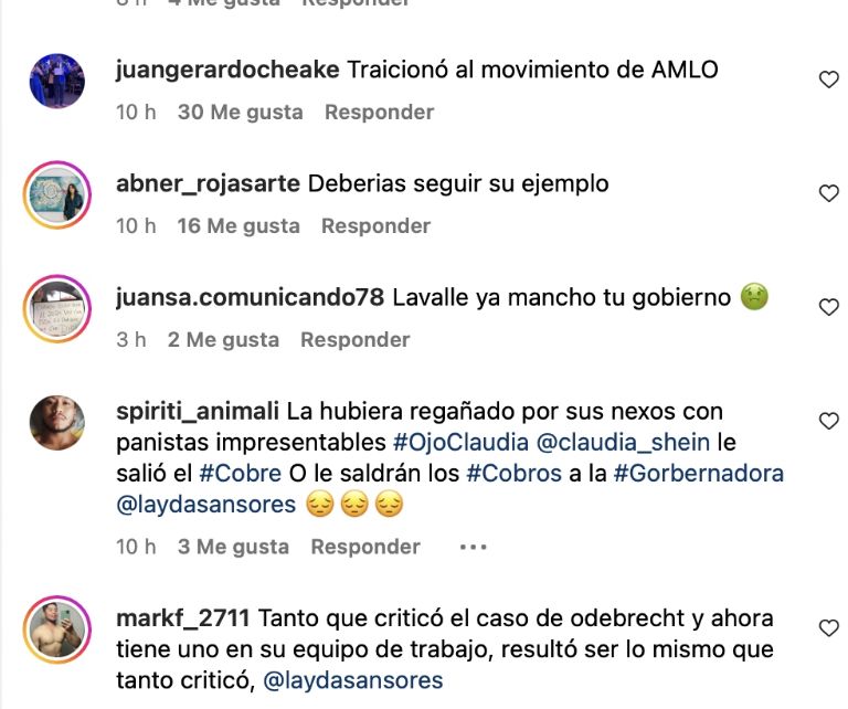 “Debería renunciar si se está contagiando de la corrupción. Lo que usted hizo es una traición a la 4T”, escribió una usuaria de Instagram.