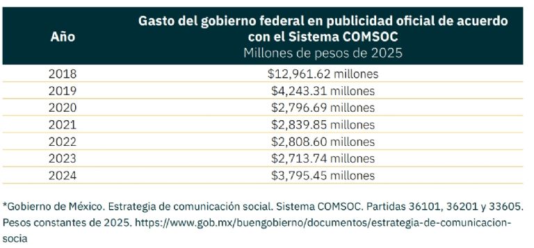 Al centrarse en los datos federales se confirma que entre 2018 y 2024 el gasto en publicidad oficial registra una reducción marcada durante el gobierno de Andrés Manuel López Obrador, en contraste con los niveles ejercidos en el sexenio anterior. En 2018, último año del gobierno de Enrique Peña Nieto y de transición hacia la administración de López Obrador, se ejercieron más de 12 mil 961 millones. En contraste, en 2019 (primer año completo de la actual administración) el gasto fue de cuatro mil 243 millones, lo que representa una reducción real de 67.3% respecto a 2018, en precios constantes de 2025. Este ajuste marcó un cambio en la política de publicidad oficial, bajo un discurso de austeridad y control del gasto en medios -se lee en el documento-.