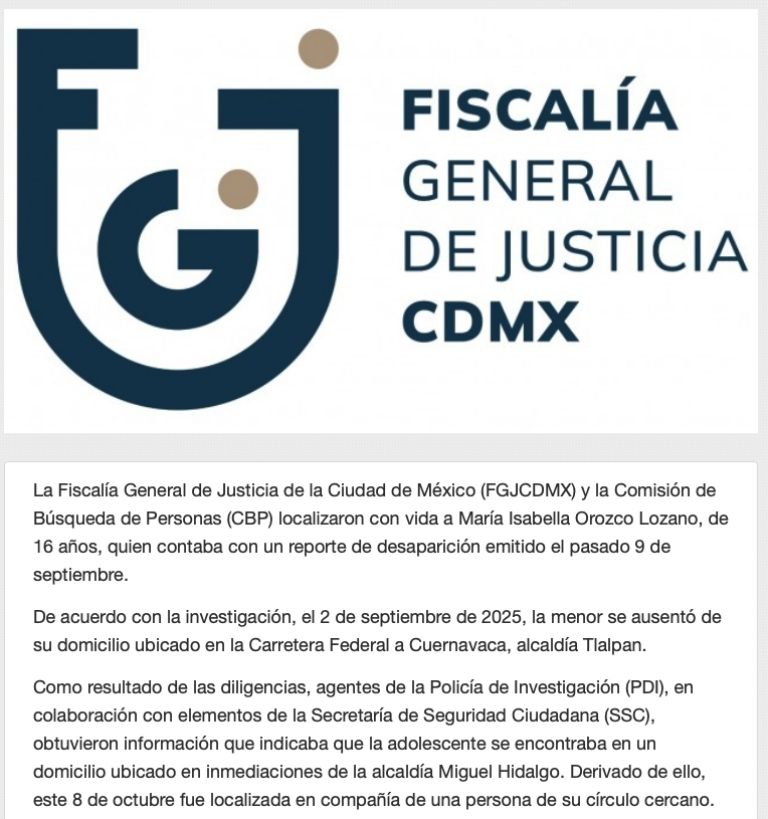 El 8 de octubre último Lozano supo por publicaciones en redes sociales que la Fiscalía capitalina localizó a su hija, no la contactaron directamente. Con la noticia, se dirigió a las instalaciones de la FGJCDMX y ahí le dijeron que en unas horas le darían información sobre Isabella, que se estaban realizando los procedimientos necesarios.
