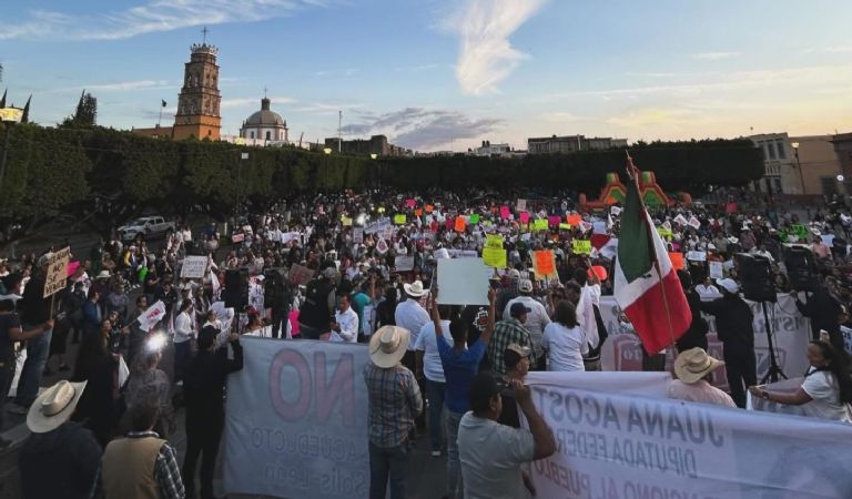 Entre consignas como “fuera Sheinbaum” y “revocación”, los manifestantes exigieron detener la construcción del acueducto, al considerar que afectará el abasto de agua en la región sur de Guanajuato.