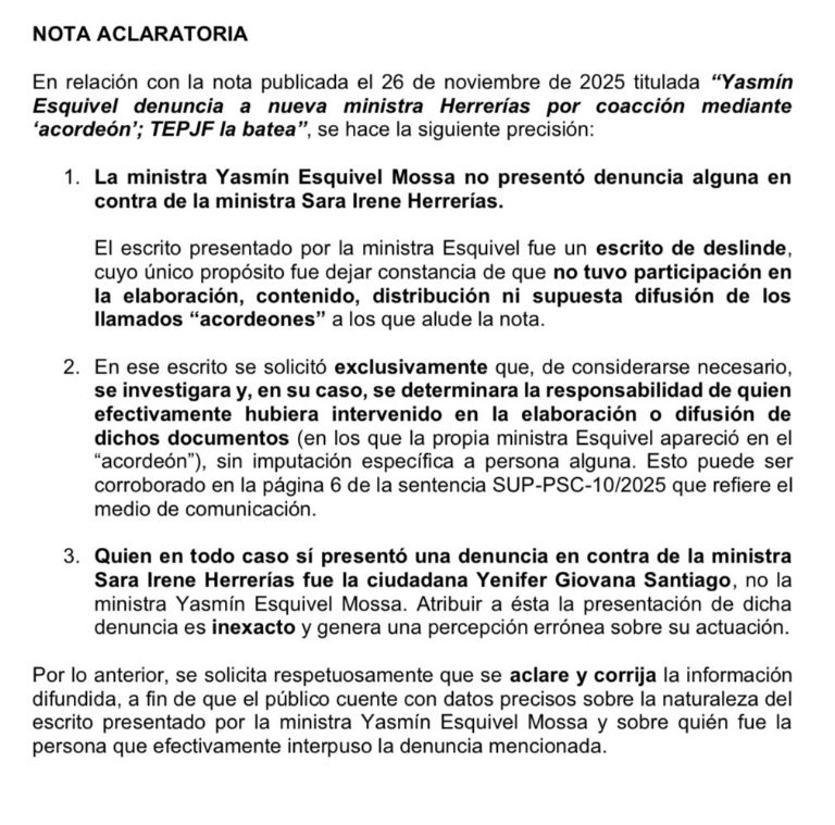 El caso resulta llamativo porque Esquivel fue una de las principales beneficiadas de las listas repartidas antes de la elección judicialCIUDAD DE MÉXICO (apro).- La Sala Superior del Tribunal Electoral del Poder Judicial de la Federación (TEPJF) resolvió hoy dos asuntos un tanto surreales sobre la elección judicial del pasado 1º de junio: los magistrados analizaron quejas de la ministra Yasmín Esquivel Mossa contra varios candidatos, incluyendo a su ahora colega de la Suprema Corte de Justicia de la Nación (SCJN) Sara Irene Herrerías Guerra, a quienes acusó de “coaccionar” e “inducir” el voto a través de los “acordeones”.