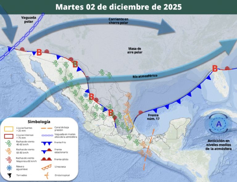 A su vez, una vaguada en niveles medios y altos de la atmósfera sobre el noroeste de México, la corriente en chorro polar y un río atmosférico, ocasionarán ambiente muy frío a gélido en la mencionada región; además de rachas de viento de 30 a 50 km/h, intervalos de chubascos en Baja California Sur, Sinaloa, Durango, Jalisco, Colima y Michoacán, y lluvias aisladas en Chihuahua, Zacatecas y Nayarit.