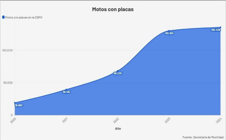 De acuerdo con cifras de la Secretaría de Movilidad (Semovi) capitalina, en el 2020 –año del inicio de la pandemia de covid-19– había 18 mil 992 motocicletas de gasolina con placas expedidas por el gobierno de la CDMX; sin embargo, para el 2024 el crecimiento del parque motero fue descomunal: pasó a 135 mil 428 unidades motoras, 613% más.