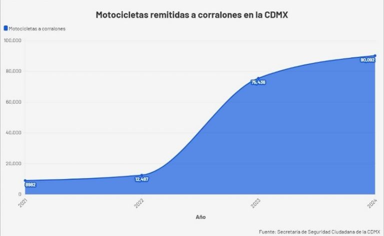 Otro concepto por el cual el gobierno puede obtener más recursos son las remisiones de motociclistas a los corralones. En este tipo de medida, el crecimiento de unidades a los sitios donde depositan a los infractores también aumentó sustancialmente en los últimos cuatro años hasta un 900% aproximadamente, según datos obtenidos de la Secretaría de Seguridad Ciudadana de la Ciudad de México.