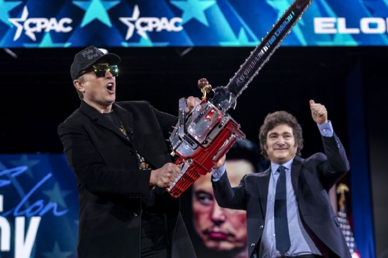 20 de febrero. Elon Musk recibe una motosierra del presidente argentino Javier Milei a su llegada para hablar en la CPAC, en Maryland, EU. Foto: AP/José Luis Magana.