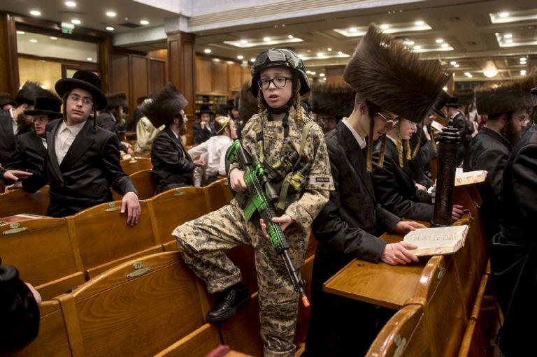 13 de marzo. Hombres y niños judíos ultraortodoxos leen el Libro de Ester, que narra la historia de la festividad judía de Purim, en una sinagoga de Jerusalén. Foto: AP/Ohad Zwigenberg.