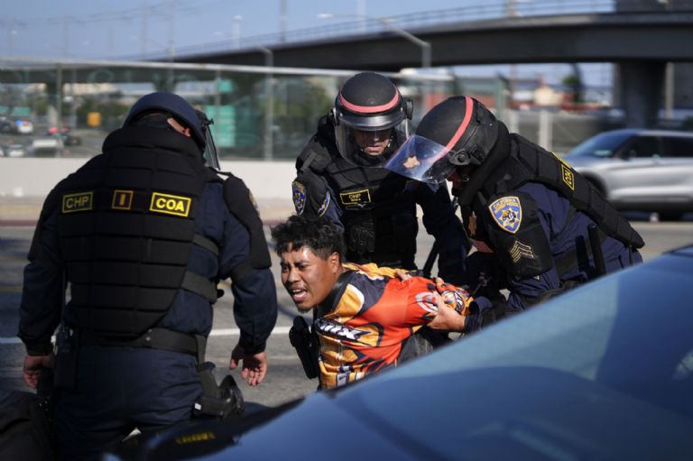 10 de junio. Un manifestante es arrestado por la Patrulla de Carreteras de California, cerca del edificio federal en el centro de Los Ángeles. Foto: AP / Eric Thayer.