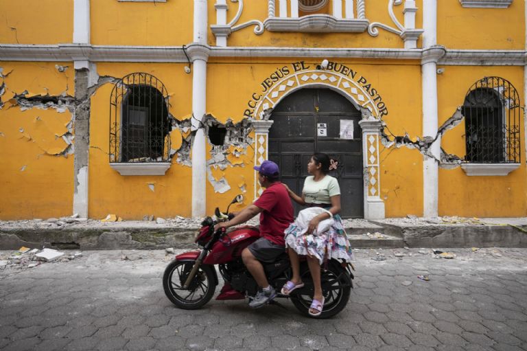 9 de julio. Una pareja pasa frente a un centro comunitario dañado tras una decena de sismos en Santa María de Jesús, Guatemala, en cuestión de horas. Foto: AP / Moisés Castillo.