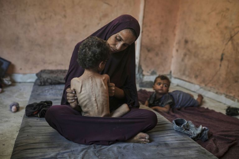 23 de julio. Naima Abu Ful sostiene a su hijo desnutrido de dos años en el campo de refugiados de Shati, en Gaza. Foto: AP / Jehad Alshrafi.