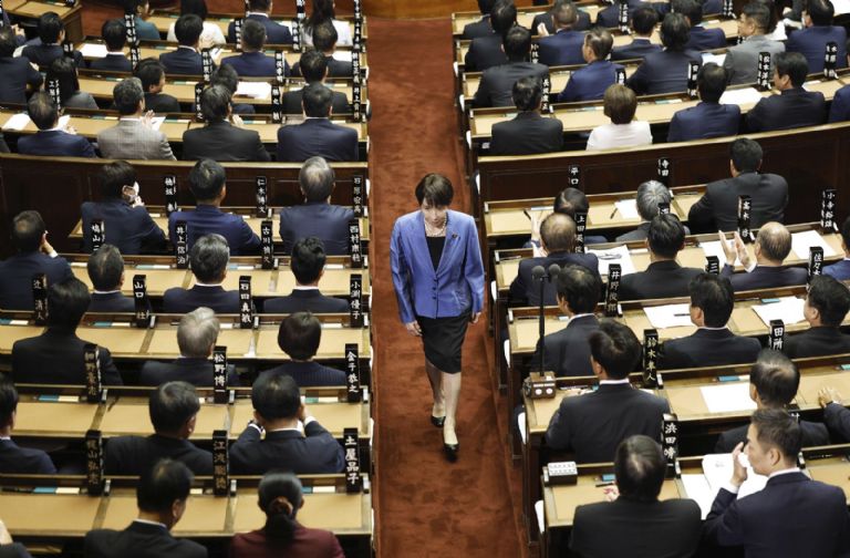 21 de octubre. Sanae Takaichi, lideresa del gobernante Partido Liberal Democrático, camina tras votar por el nuevo primer ministro de Japón en la cámara baja, en Tokio. Foto: Kyodo News vía AP.
