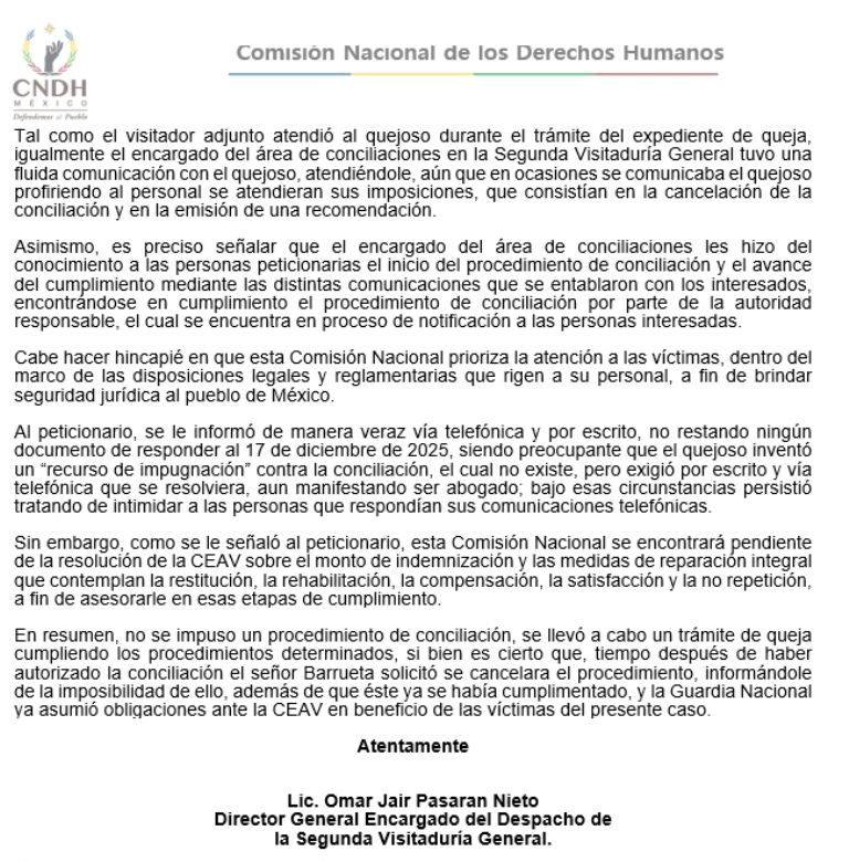 El acta conciliatoria de este caso, precia el escrito, fue aceptado por el director de Quejas, Conciliaciones y Medidas de Protección en Derechos Humanos de la GN, el 2 de septiembre de 2025 en las instalaciones del organismo, con lo que se dio por solucionado el expediente.