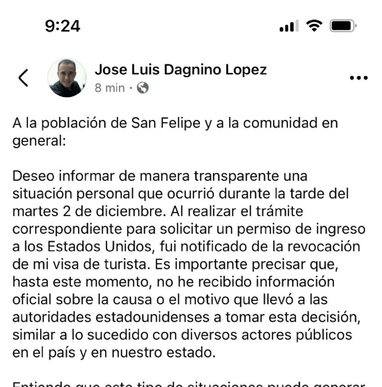 “El trámite correspondiente para solicitar un permiso de ingreso a los Estados Unidos, fui notificado de la revocación de mi visa de turista. Es importante precisar que, hasta este momento, no he recibido información oficial sobre la causa o el motivo que llevó a las autoridades estadunidenses a tomar esta decisión, similar a lo sucedido con diversos actores públicos en el país y en nuestro estado”, según escribió.