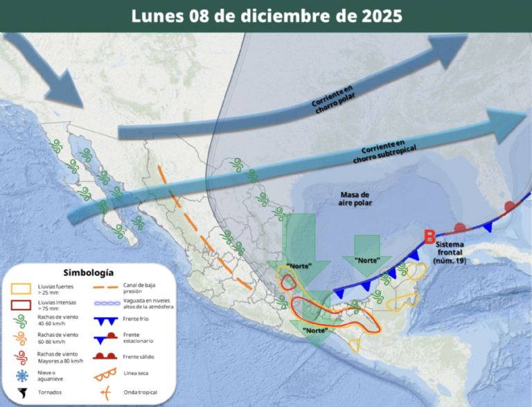 Durante la noche del domingo y madrugada del lunes, el nuevo frente frío número 19 ingresará al norte y noreste del país, en interacción con una vaguada en niveles medios y altos de la atmósfera, y con la corriente en chorro subtropical, originarán lluvias puntuales fuertes en San Luis Potosí (región Huasteca), Querétaro (región Sierra Gorda), Hidalgo (regiones Sierra Alta, Huasteca y Sierra de Tenango), Puebla (regiones Sierra Norte y Sierra Nororiental), Veracruz (regiones Huasteca Alta, Huasteca Baja, Totonaca y Nautla) y chubascos en Tamaulipas y Nuevo León.