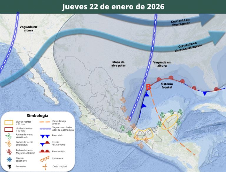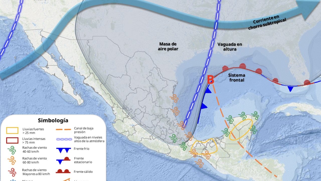 El jueves, el sistema frontal permanecerá sobre el golfo de México e interaccionará con la vaguada en niveles altos de la atmósfera, propiciando chubascos y lluvias puntuales fuertes en zonas del oriente y sureste del país, incluida la península de Yucatán.