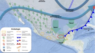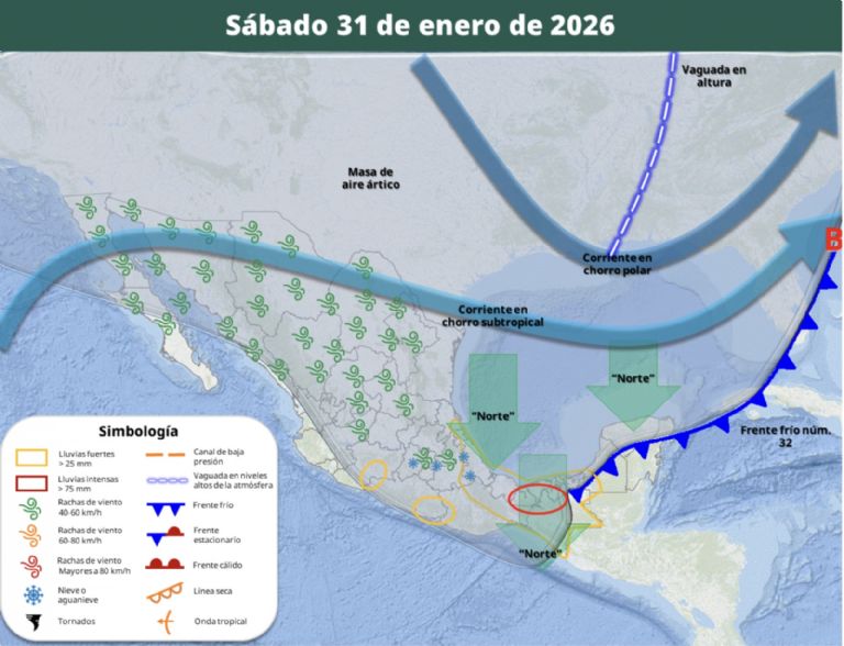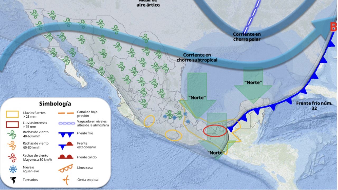 La masa de aire ártico que lo impulsa mantendrá evento de “Norte” muy fuerte a intenso en el litoral del golfo de México, península de Yucatán, istmo y golfo de Tehuantepec, con oleaje elevado en sus costas; así como el marcado descenso de las temperaturas en gran parte del país, con heladas en zonas altas de la Mesa del Norte y Mesa Central.