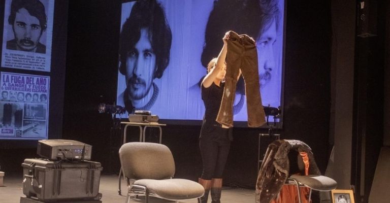 En escena, Alicia cuenta también la historia de Enrique Pérez Mora, el Tenebras, su papá, mientras Shantal muestra una camisa a cuadros, un pantalón de pana y un suéter rojo. “Mi mamá vio en el periódico el cuerpo de mi papá con la ropa que ella le había ayudado a escoger”, recuerda. La pareja se conoció durante la fuga de Oblatos; en mayo, Alicia de los Ríos estaba embarazada, y un mes después Enrique murió en un enfrentamiento con agentes de seguridad.