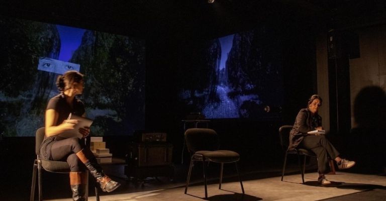Entra en escena la performer Shantal Saad. Luego, Alicia de los Ríos Merino se dirige a una de las tres sillas colocadas al frente del escenario. Baja la luz.