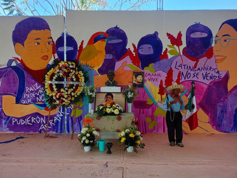 Durante el acto, Nayeli Flores Soberanes, hermana de Samir, recordó su legado como maestro y luchador social. Señaló que su memoria sigue viva en la escuela, en la familia y en la niñez, y afirmó que permanece presente en las luchas y en la conciencia comunitaria.