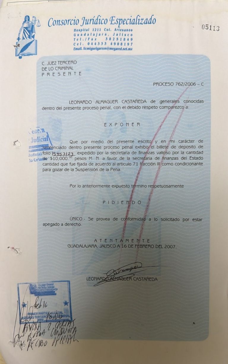 Casi tres años después, el 16 de febrero de 2007, el hoy legislador solicitó la suspensión del proceso penal. En un escrito firmado como sentenciado, presentó un comprobante de depósito expedido por la Secretaría de Finanzas con el 1585 3123, correspondiente al monto fijado como condición para acceder a dicho beneficio legal, conforme al artículo 71, fracción tercera.