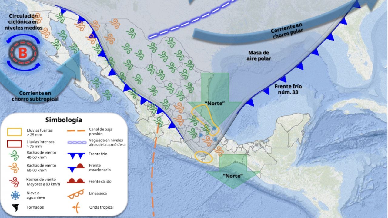 Frente frío 33 azotará el miércoles con lluvias, granizo, nieve, vientos y oleaje a estas entidades