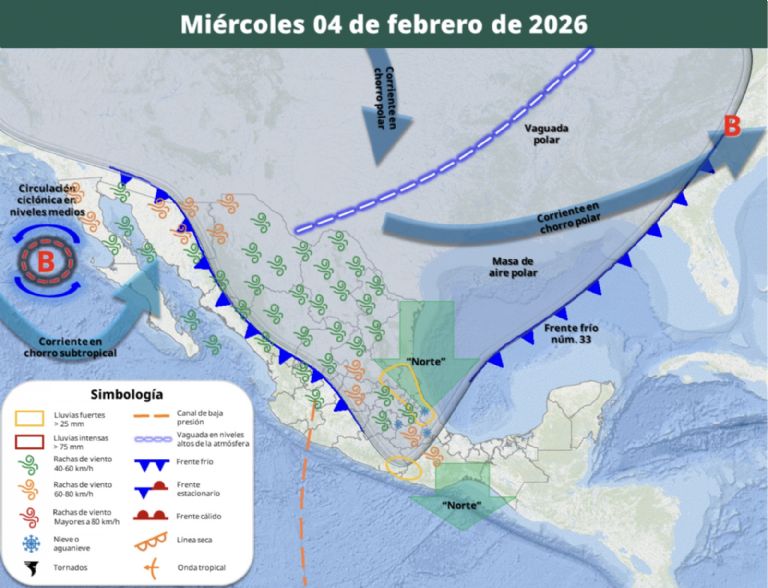 Pronóstico de lluvias para el miércoles 4 de febrero: