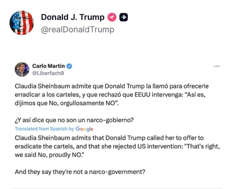 La publicación original es del usuario @Liberfach0 y dice: “Claudia Sheinbaum admite que Donald Trump la llamó para ofrecerle erradicar a los cárteles, y que rechazó que EEUU intervenga: 'Así es, dijimos que No, orgullosamente NO'”.