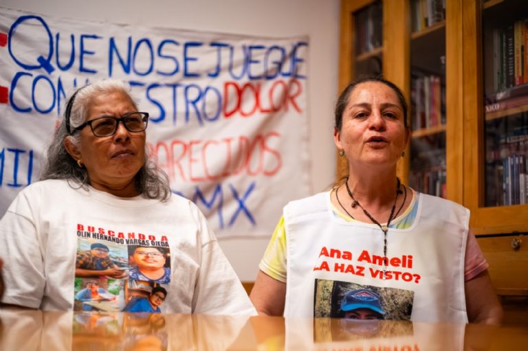 Ambas familias se presentaron en las instalaciones de Proceso con las fichas de desaparición de sus hijos impresas y una manta en la que escribieron: “¡Que no se juegue con nuestro dolor! Seis mil desaparecidos en la CDMX”.