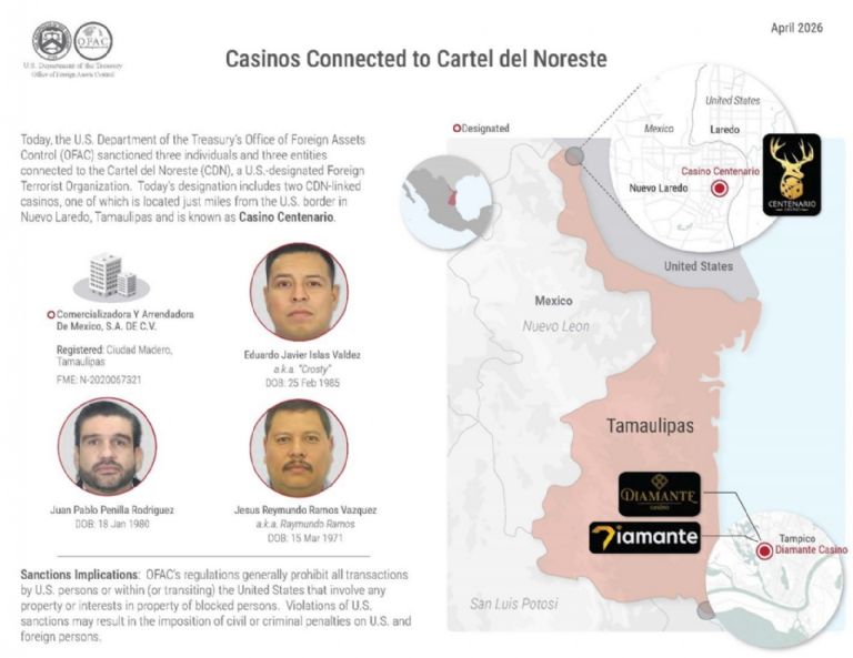 En un boletín, el Departamento del Tesoro anunció sanciones contra dos casinos de Tamaulipas, así como contra el abogado Juan Pablo Penilla Rodríguez –quien defendió entre otros a Miguel Ángel Treviño, el líder de los Zetas conocido como “Z-40”--, Eduardo Javier Islas Valdez, “Crosty”, un presunto jefe de la célula de tráfico de personas del Cártel del Noreste, así como contra Raymundo Ramos.