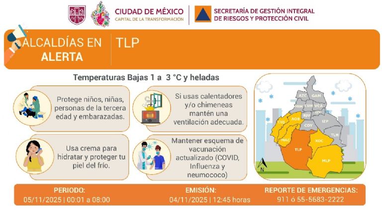Asimismo, se activó Alerta Amarilla por pronóstico de temperaturas bajas para la madrugada y mañana del miércoles 05/11/2025 en las demarcaciones Álvaro Obregón, Cuajimalpa, Magdalena Contreras, Milpa Alta y Xochimilco.